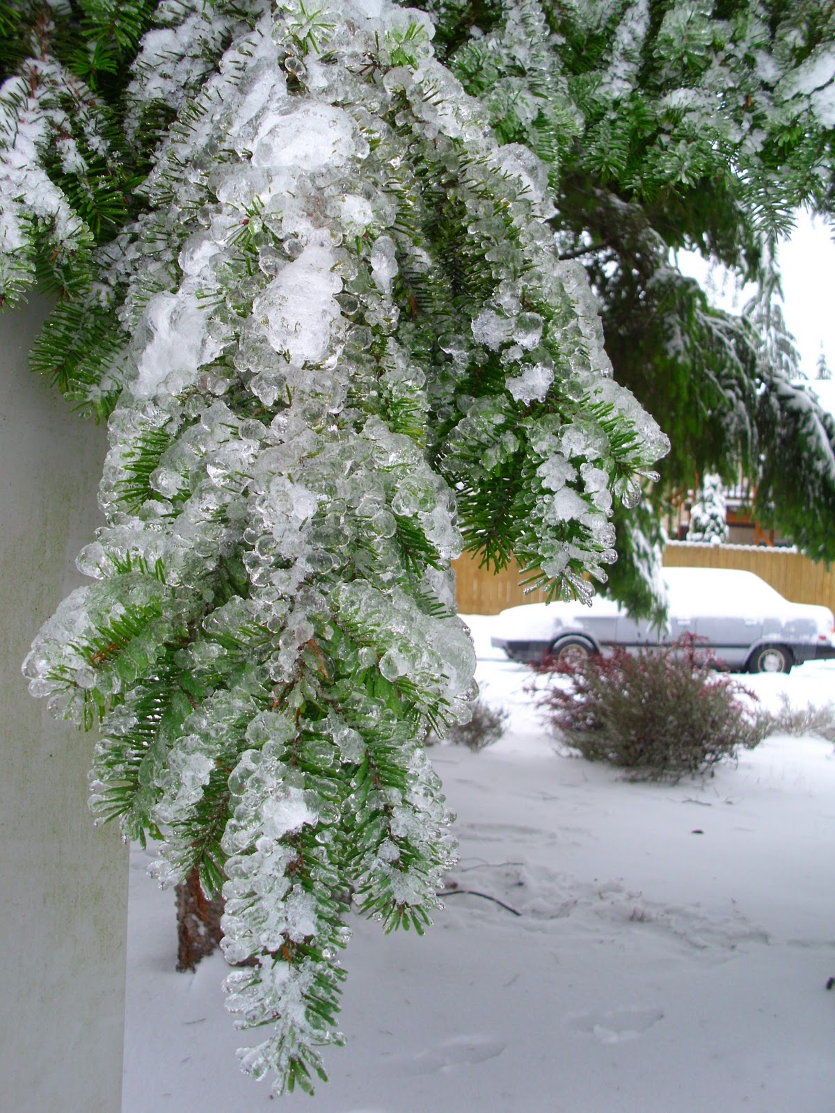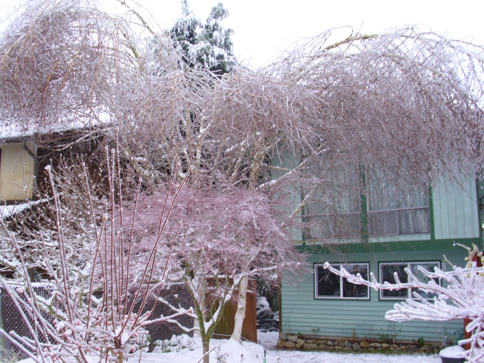 Front yard with very flexible, ice-embedded jacquemontii birch trees.