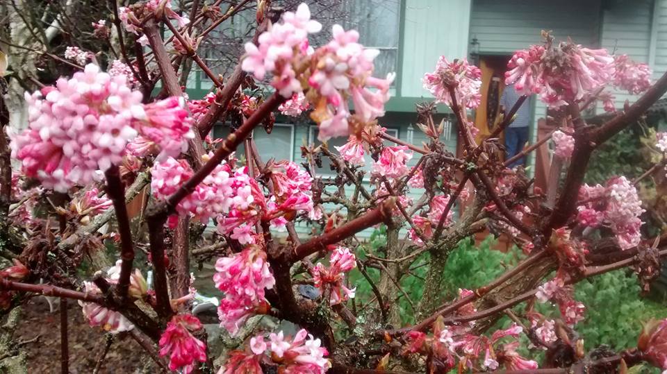 What a parallel for life.  As I sit here typing on this rain-soaked day, the old, tired earth is waking up. There are signs everywhere.  Although the mantle of ground has been beaten down, grass browned and soggy, leaves laying in saturated piles scattered about, the scilla and tulips are peeking out. The Crocosmia are threatening to invade the vinca, my Pink Viburnum puts on its saucy show.